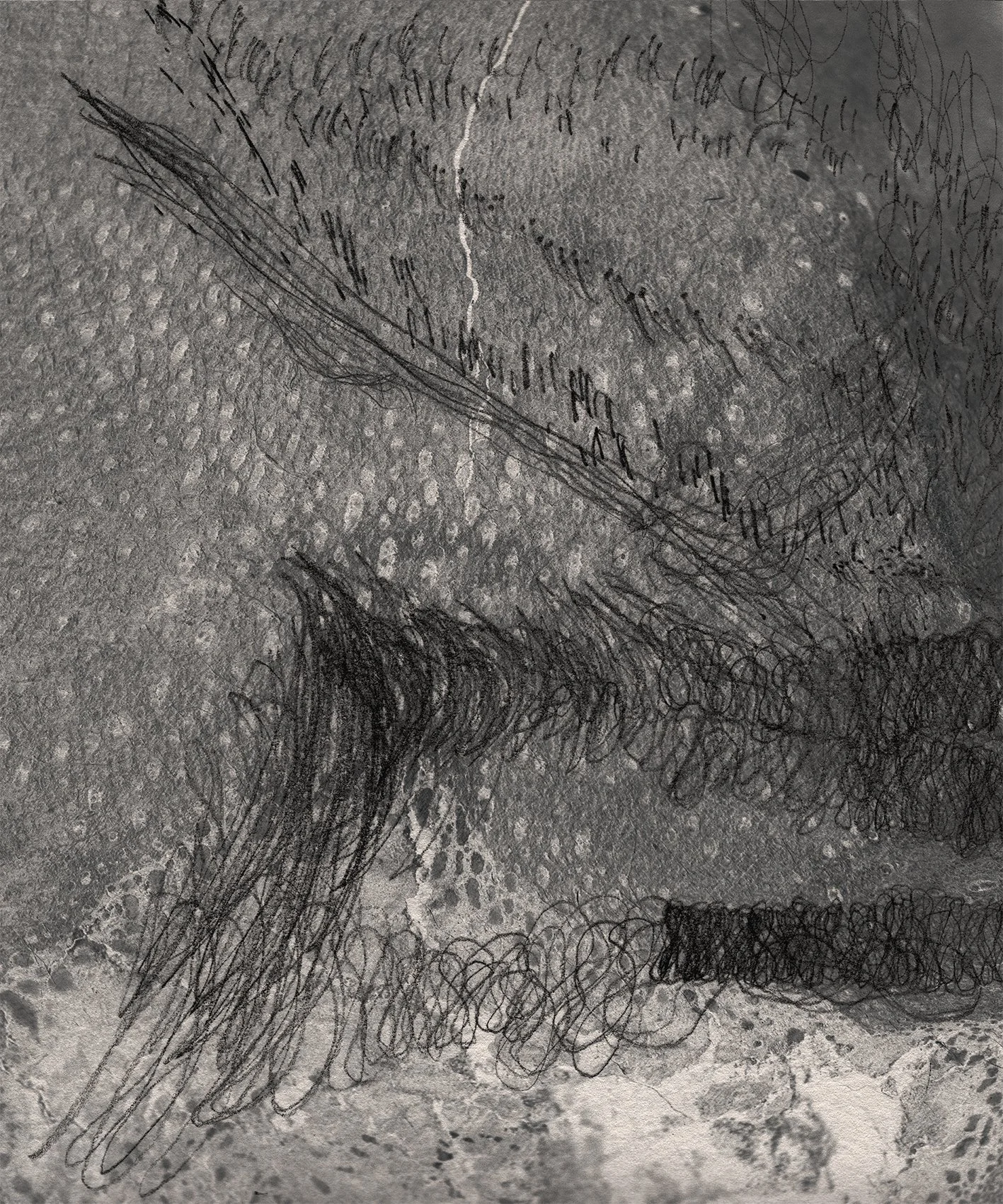 Four large blankets hang around the central floor, catching and diffusing light. These digitally printed textiles bring together body, land, and sensorimotor mark-making. Fragments of skin, grain, gesture, and trace gather across their surfaces as partial figures and terrains.