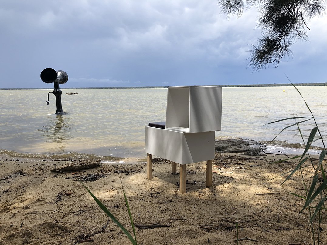 Analogue Environmental Sound Synthesiser is a sculptural sound work that brings environmental and bodily rhythms into a shared listening space at the edge of Lake Cootharaba.